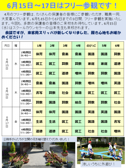 6月のフリー参観と学校のようすをお知らせします。