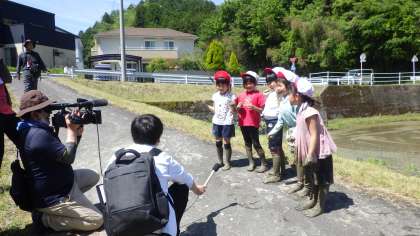 初めての田植えを終えて、インタビューを受ける1年生。