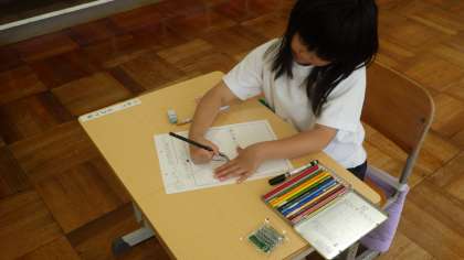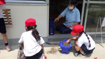 土を入れて肥料と混ぜたり、種を入れる穴を指で開けたりと、みんな真剣です。
