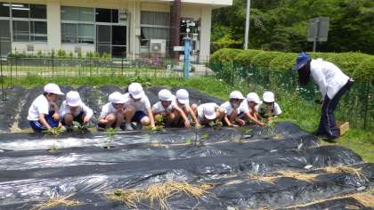 今日は2年生の子たちが、自分たちの植えた苗の観察に来ていました。