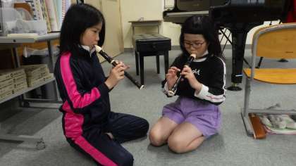 今日は「シラソ」の音を出せるようにするのが目標です。トーンホールに指の腹を当てて、しっかり穴をふさぐのが、なかなか難しいようです。4年生がマンツーマンで教えていました。