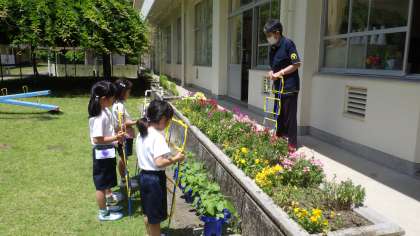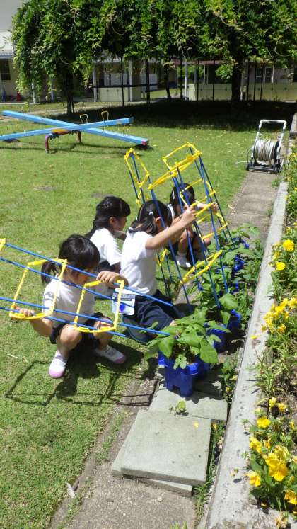 先生の説明を聞いて、大切なアサガオの葉を傷つけないように気を付けながら支柱を立てていました。花が咲くのが待ち遠しいですね。