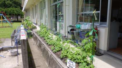 3年教室前の花壇のツルレイシ(ゴーヤ)が大きくなってきました。4年教室に届くのはいつになるかな?