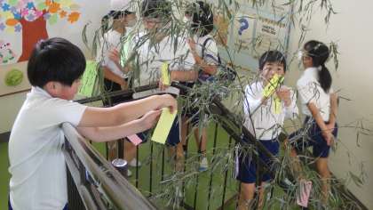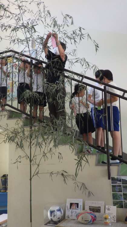 今日は1年と6年が短冊を付けました。6年生の子たちは、1年生の子が願いを書いて大切そうに持ってきた短冊を付けてあげていました。