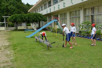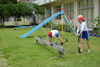 水しぶきを上げて勢いよく飛び出すペットボトルに歓声が上がりました。もっとよく飛ばすにはどうしたらよいか、水を増やすのか、空気を増やすのか、試行錯誤しながら楽しみました。