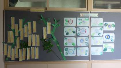 企画委員会主催で作った七夕飾りが、吹ぎ抜けにあります。中部小全員の願い事が短冊に書かれて揺れています。みんなの願いが叶いますように…。