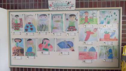 1・2年生の「ぼく・わたしの すきな のうさくぶつ」の作品掲示、見ていて楽しいです。学校にいらっしゃった折には是非ご覧ください。。