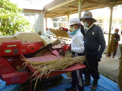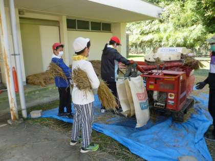 9月26日、山内さんのご指導で5年生が脱穀をしました。