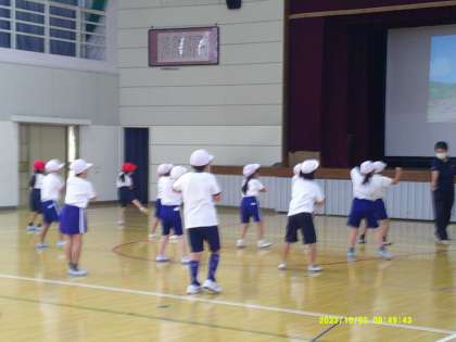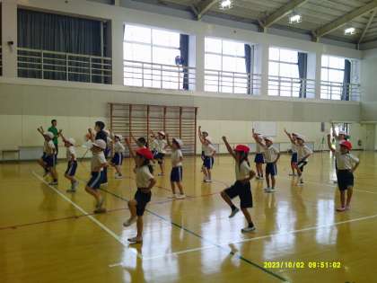 かねてから練習していた「ジャンボリミッキー」を、今日は初めて3学年一緒に練習しました。入場の仕方や隊形の変え方など盛りだくさんの内容でしたが、皆真剣に取り組んでいました。ミッキーになって飛び跳ねる姿がとても可愛いです。運動会での発表を楽しみにしていてください。