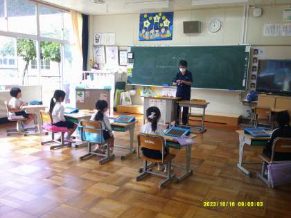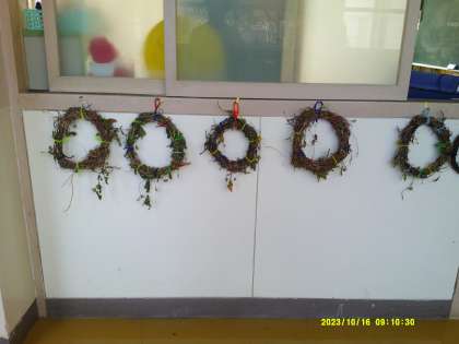 1年生は、育てていたアサガオのツルを使ってクリスマスのリースを作ります。今日は、どんなリースにしたいのか、一人ひとり考えました。材料を用意するために、リボン、花、鈴、木の実など必要なものをリストアップしていました。