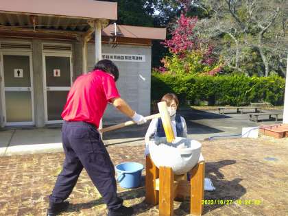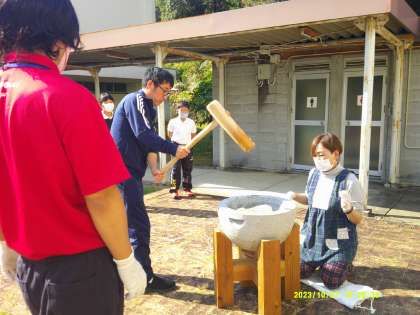 収穫したもち米を使って、職員で餅つきをしてみました。慣れないことなので手際よくできず時間がかかってしまいましたが、何とかお餅が出来上がりました。