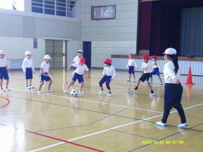 ボールを蹴る練習をした後、ボール蹴りあそびをしました。