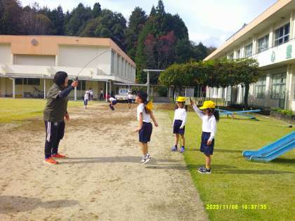 外に出て遊ぶのが気持ちの良い気候ですね。最近は体育の授業でもなわとびが始まったようで、皆縄を持って外に出てきます。岩田先生と「ゆうびんやさんのおとしもの」をして遊んだり、渡邉先生に二重跳びのやり方を教わったりして楽しそうです。