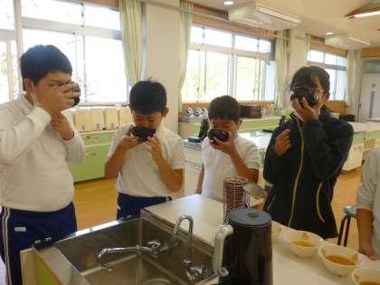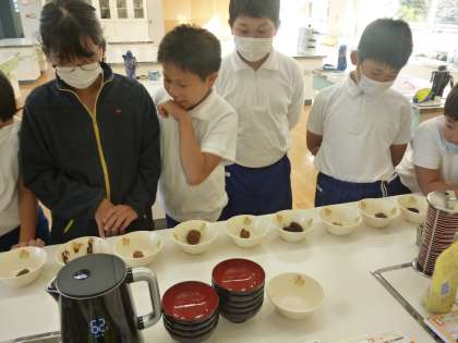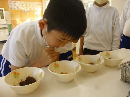 11月7日の授業で、味噌の味比べをしました。子ども達が家で使っている味噌を少し持ってきて、見た目や香りを調べました。そして、お湯でといて実際に飲んでみて、味の違いを比べてみました。同じ赤、合わせでも味が違ったり、出汁がある、ないだけでも深みが全然違うなど、たくさんの発見をしました。