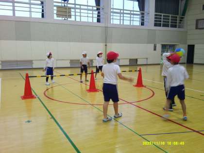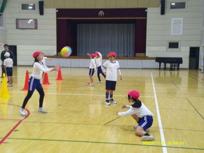 「プレルボール」というボールゲームです。床へボールを打ち付けてパスをする練習をした後、3人ずつのグループに分かれてゲームをしました。