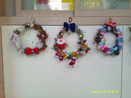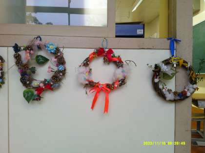 以前から準備し、制作を進めていたアサガオのツルを使ったクリスマスリースが完成しました。飾るものも一人一人工夫しています。まだまだ飾りを付け加えてよいそうですので、さらに素敵になると思います。