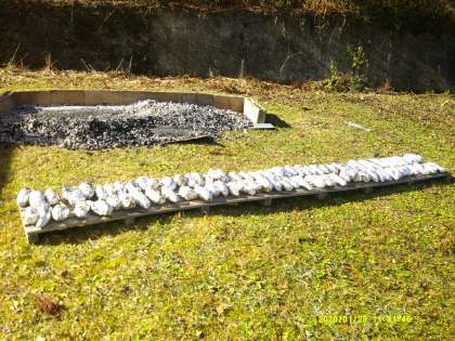 燠を被せてからおよそ1時間。焼き芋の美味しそうな匂いがしてきました。芋を取り出して並べます。中部っ子班で集まって焼き芋をいただきました。