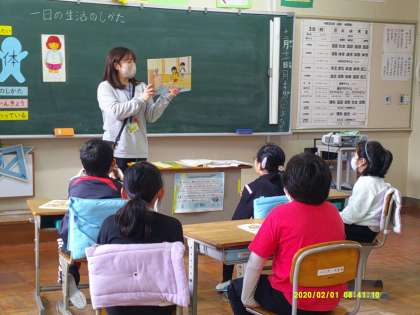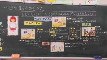 飯田先生の保健の授業です。紙芝居を見た後、主人公の元気のない女の子に「一日の生活のしかた」のアドバイスを考えます。「朝は早く起きたほうがいいよ」「朝ごはんを食べないと元気が出ないよ」など、自分の生活と比べながら考えることができました。