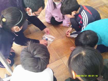 「じしゃく」の授業です。磁石にくっつけた鉄くぎは磁石になっているのか、を予想して実験しました。磁石から外した鉄くぎが砂鉄を引き付けることや、方位磁針に近づけると磁石と同じような反応することを確かめました。