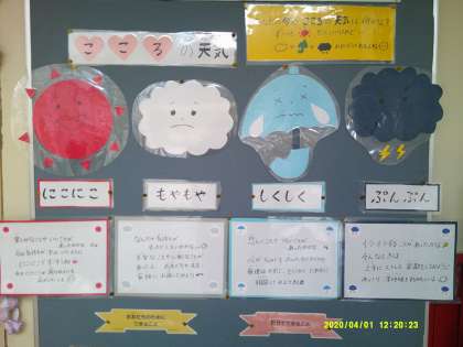 今日の心の天気が、晴れ、くもり、雨、雷の4種類の中のどれに当てはまるかを考えると、どういうことに気を付けて生活したらよいかのヒントがもらえます。
