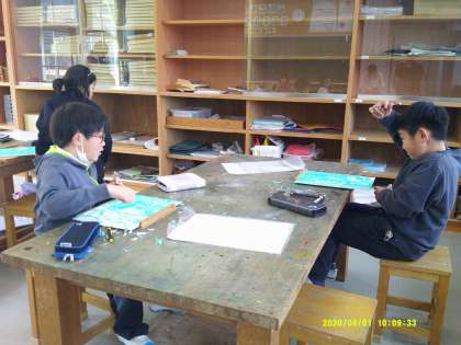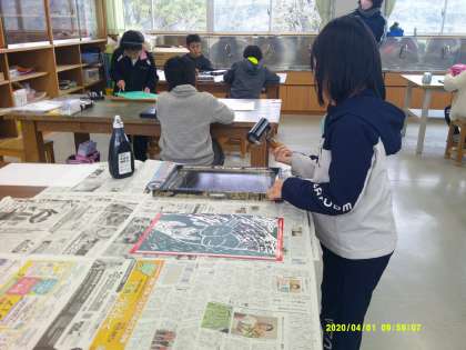 版画に取り組んでいます。下絵を版木に写したものを彫刻刀で彫っています。彫れた子はインクを付けて印刷です。彫刻刀で怪我をしないよう、気を付けて彫り進めていました。