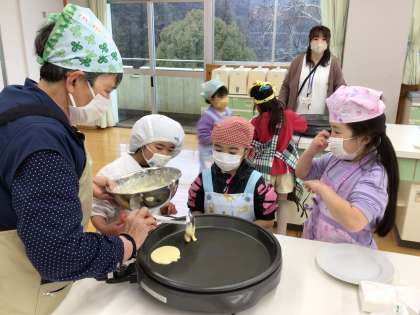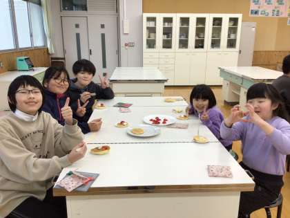 1年生が6年生に感謝の気持ちを伝える会を開きました。6年生と一緒にホットケーキを焼いて食べました。6年生から「1年生の優しさがうれしかった」と言ってもらって、本当にうれしそうでした。手をまっかにして片付けも頑張りました。