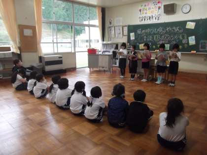 2年生が「風のゆうびんやさん」の音読発表会をしました。どんなところに気を付けて読むかを決め、練習してきたおかげで、とても上手に発表出来ました。1年生が真剣に聞いてくれました。頑張りに拍手です。