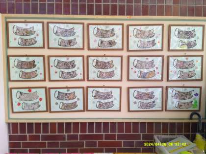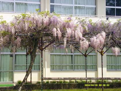 学校の藤棚もきれいに咲き出しました。昇降口には、1,2年生のこいのぼりが泳いでいます。