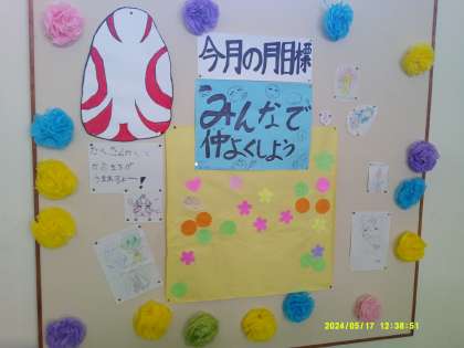今月の月目標は「みんなで仲よくしよう」です。写真は企画委員会の子ども達が作ってくれた掲示です。「月目標を頑張っている人を言葉にしてつたえよう」ということで、たくさんの子がいろいろな場面での友達の様子を書いて貼ってくれています。今日ののびのびタイムでは、多くの子が外に出て、思い思いのことをして楽しそうに遊んでいました。皆仲がいいですね。