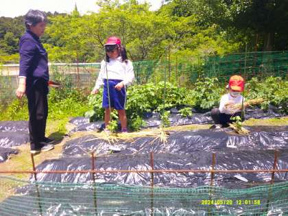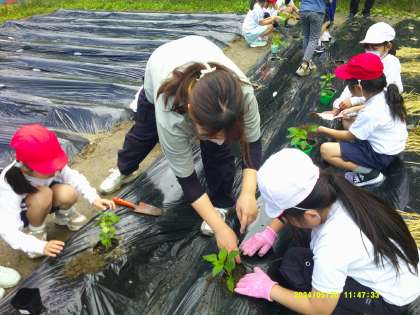 1,2年生が一緒に畑に野菜の苗を植えました。3人ずつのグループに分かれて、ナス、ピーマン、オクラ、キュウリ、ズッキーニ、枝豆の苗を植えました。2年生の子が1年生に植え方を丁寧に教えていました。最後に根元に藁を敷いて、水やりをしました。水やりの時には、「大きくなあれ、おいしくなあれ」と声を掛けていました。これからのお世話もこのグループでやっていきます。美味しい野菜がたくさんできますように。