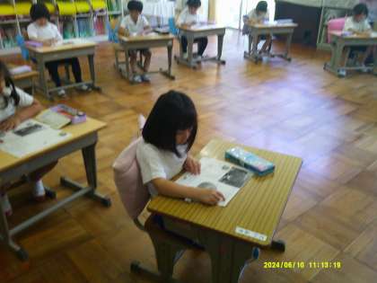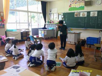 中央図書館から高村先生が来てくださり、調べ学習の勉強をしました。「どうやってみをまもるのかな」をテーマに、はりねずみについて調べました。最後に身を守っている動物の写真をいろいろ見せていただきました。カエルが保護色になって鳥から身を守っていることを知って、驚きの声をを上げていました。