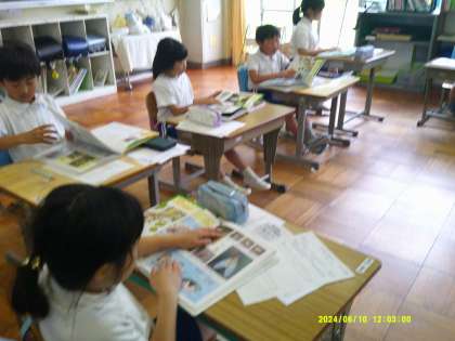 中央図書館の高村先生による3年生の授業です。3年生は調べ学習の手順の学習です。図鑑を使って調べ、レポートのまとめ方を教えて頂きました。参考文献をきちんと書くことの大切さを心に留めてくれたでしょうか。