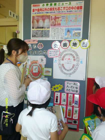6月は虫歯に関する掲示です。飲み物に含まれる砂糖の量の掲示があります。ジュース類には驚くほどの砂糖が含まれているんですね。びっくりです。