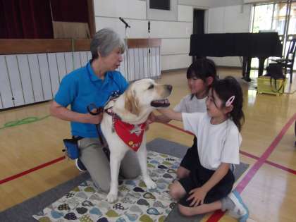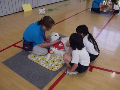 6月12日(水)1,2年生を対象に動物愛護教室がありました。ボランティアの方々から犬と触れ合うときに大切な事を教えて頂きました。子ども達は目を輝かせて嬉しそうに触れ合っていました。ボランティアの方々に折り紙のカーネーション、犬には手作りメダルをプレセントして感謝の気持ちを表しました。