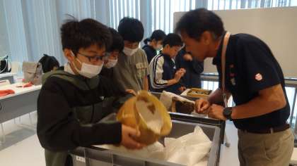 6月18日(水)、新しくできた「豊田市博物館」に、6年生が出かけました。縄文土器と弥生土器の実物を持って比べたり、その時代の服装を着たりなど、貴重な体験ができました。入口のガラスの展示にも興味津々!楽しく学ぶことができました。