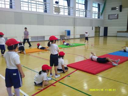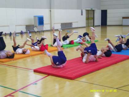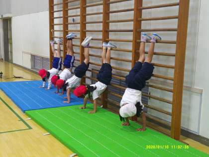 6月21日(金)雨降りでしたので、体育館でマット運動です。丸太になってごろごろ転がったり、ごろんと転がって足でジャンケンをしたりしました。肋木(ろくぼく)を使って逆立ちしたりして体を動かしていました。