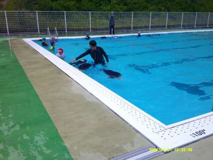 梅雨入り宣言が出ましたが、6月24日(月)は何とか晴れ間が覗きました。体を水に慣らした後、水中で両手で膝を抱いてだるまさんになって浮いたり、大の字になって伏し浮きをしたりしました。回数を重ねるごとに出来る子が増えてきます。