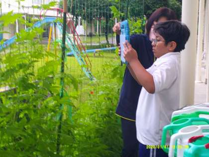 ツルレイシ(ゴーヤ)の生長を観察しています。6月27日に観察した時より、どのくらい茎が伸びているか予想をしてから測ってみました。4日間で30cm〜60cmも伸びていて、びっくりです。花も咲き始めましたが、雄花ばかりで、雌花は見当たりませんでした。生長の様子をタブレットで写真を撮り、記録をまとめました。