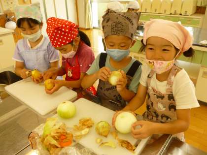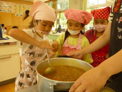 カレーを煮込むのも頑張りました。自分たちで育てた野菜を使って自分たちで作ったカレー、美味しくないわけがないです!野菜好きの子が増えますね。「ごちそうさま〜」