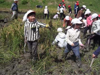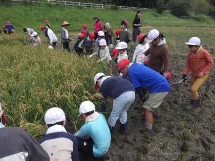 9月11日、5年生が中心になって全校で稲刈りをしました。5年生は事前に稲刈りについて6年生に教えを受けたり、下学年に説明に行ったりと準備を進めてきました。当日は6年生のサポートもあり、作業は順調に進みました。皆一生懸命作業をしてくれました。毎年のことですが、地域の方々、ボランティアの方々、お忙しい中ご協力頂きありがとうございました。
