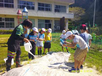 9月13日「雨水のゆくえ」の授業で、実験をして水の流れ方を観察しました。タブレットで写真を撮って記録を書き、皆でまとめをしました。