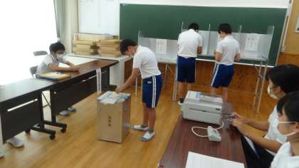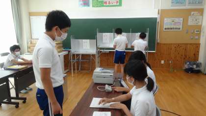 9月12日、市役所から実際に選挙で使う器具を持ってきていただき、市長を選ぶ選挙の疑似体験をしました。選挙に興味がもてました。18歳になったら早速投票に行きたいと、6年生は張り切っています。