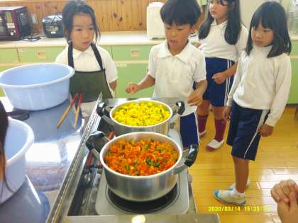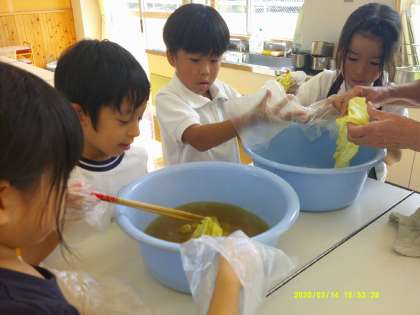 教室横の花壇のマリーゴールドで花染めをしました。初めに輪ゴムで布を縛ります。次に花を摘んできて、煮て色を出した液に布を浸して染めます。輪ゴムで縛ったところが染まらずに模様になりました。素敵な色に染まりました。