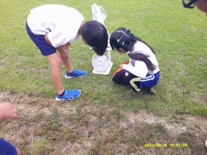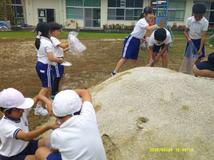 1キログラムの重さを実感するため、ビニール袋に砂を入れて1キログラムの重さにする勉強です。2人ずつチームに分かれて、1キログラムの砂袋を作りました。ピッタリの重さの砂袋を作るチームもありました。すごい!