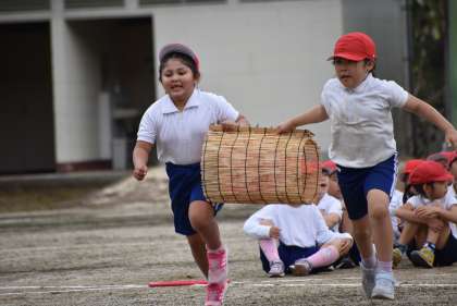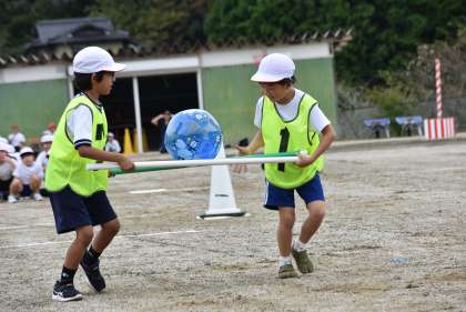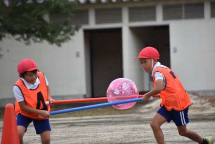 1〜3年の演技です。道具を使ってボールを運びます。どの道具を選ぶのかも大事!さて、勝敗は?