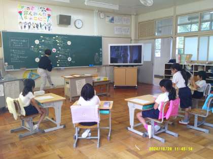 「自然観察の森で学んだことをふりかえろう」というめあてです。目、鼻、耳、手と心で感じたことを、自分なりにプリントに書き出し発表します。どの子も積極的に発表でき、友達の意見もしっかり聞けて、素晴らしいなと思いました。