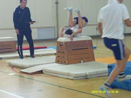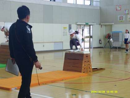 とび箱運動です。台上前転と抱え込み跳びです。とび箱の段数を1段ずつ高くしてあって、低い方が跳べたら高い方に挑戦です。とび箱はちょっと苦手という子もいて、恐怖心と闘いながらも頑張っていました。