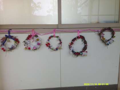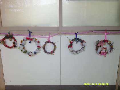 生活科で栽培していたアサガオのツルを使って、リース作りをしました。リボンや綿などで飾り付け、素敵なリースが出来上がりました。廊下に飾ってあります。
