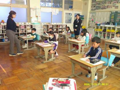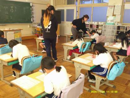 1年は硬筆習字での書き初めです。お手本をよく見て、形をまねして…みんな真剣に取り組んでいます。一生懸命になるあまり、だんだん姿勢が悪くなる子もいます。まず、良い姿勢で書くことが美しく書くコツかもしれませんよ。