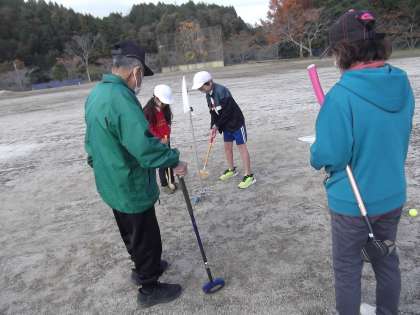 11月28日(木)3年生が小原地区の高齢者の方々とグランドゴルフで交流しました。3年生は先日、高齢者疑似体験(80歳を想定)を行い、「目が見えづらい」「耳が聞こえづらい」「腕が上げづらくて高いところのものが取りづらい」「手先がこわごわしている」など高齢者の大変さを体験しました。それをふまえてグランドゴルフ交流会を行いましたが、高齢者の方々の上手さに子ども達は驚いていました。一言で「高齢者」といっても、いろいろな方がいらっしゃることに気づくことでき、視野が広がりました。